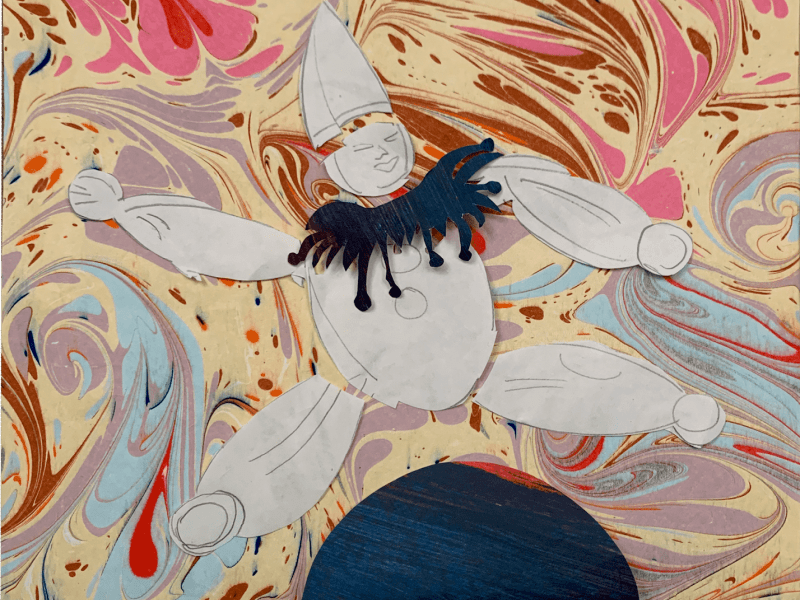 Meestal wordt hij zwart/wit afgebeeld, maar bij mij bekent hij kleur. Vaak staat de pierrot voor melancholie en onbeantwoorde liefde, maar de mijne laten zich daardoor niet uit het veld slaan. Wel hoop ik dat zijn fijngevoeligheid overkomt.